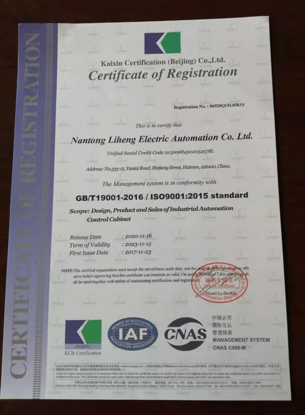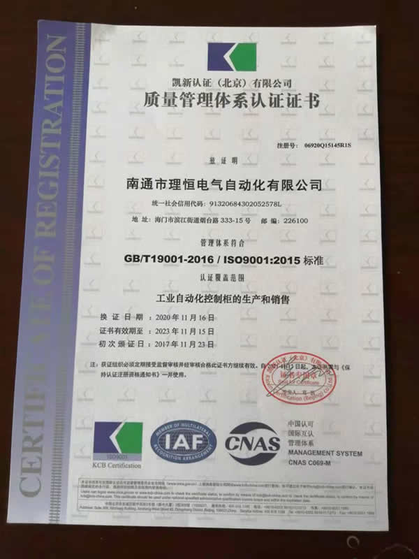 近日,我司工業(yè)自動化控制柜生產(chǎn)和銷售的全面質量管理體系通過有關專家組織的現(xiàn)場考評驗收,公司管理體系符合GB/T19001-2016/ISO9001:2015標準,換取新證。