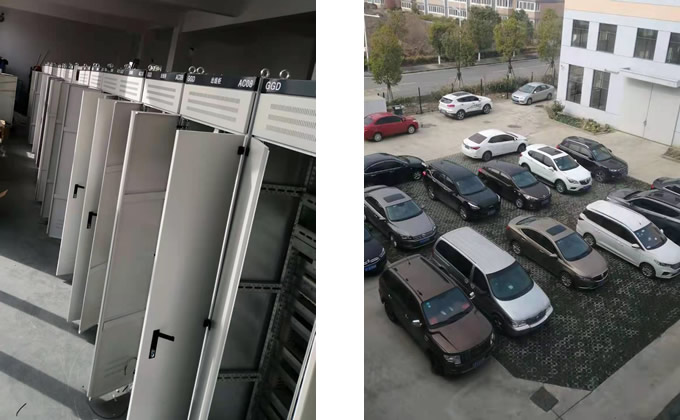 第二生產(chǎn)車間成一字排開的湖北省龍翔制藥污水處理電氣自控項(xiàng)目的電控柜和公司員工停車場一角